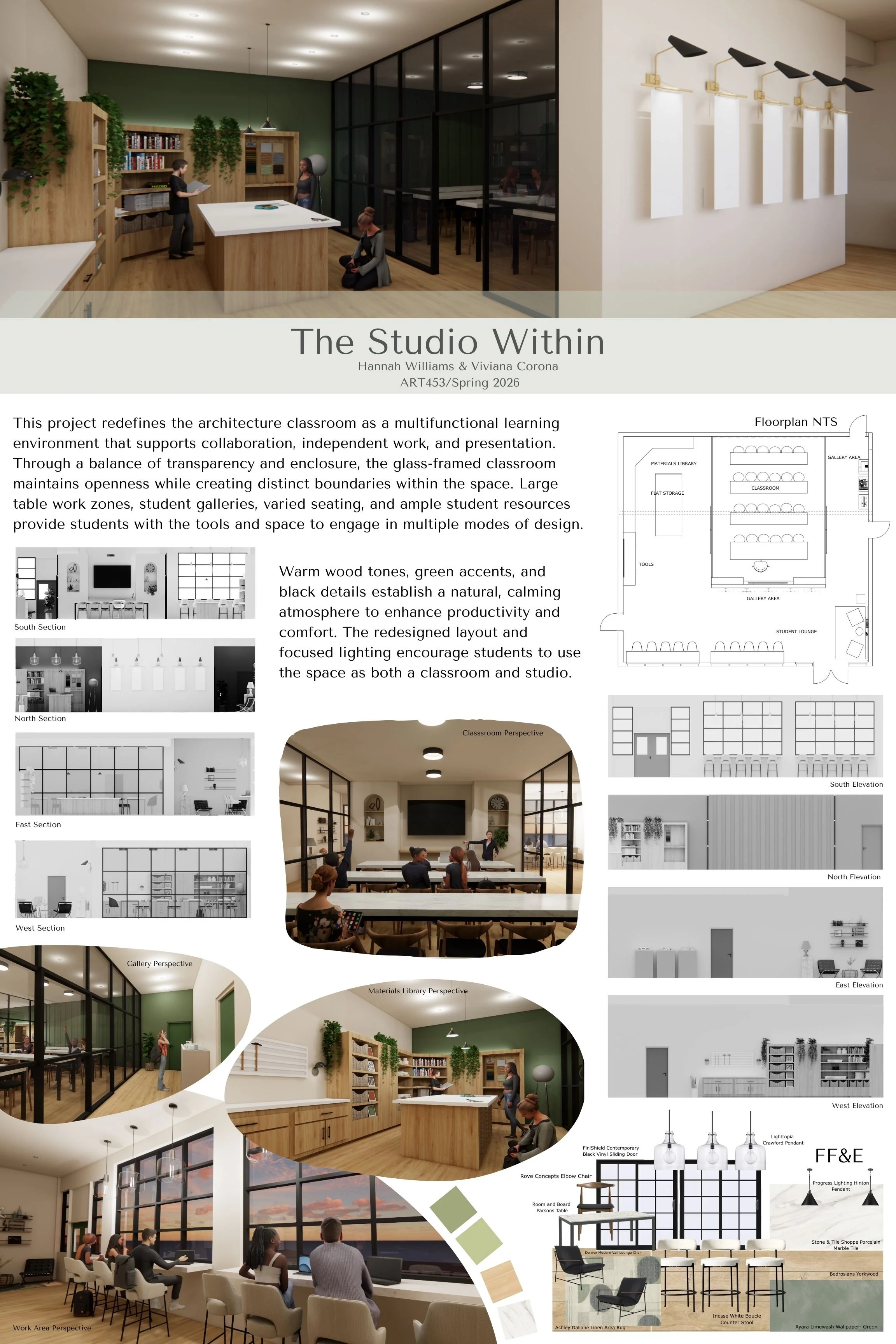 A remodel of the existing classroom aimed at creating a multifunctional, productive, studio space. Includes a visual representation and construction documents. This design was created through collaboration.